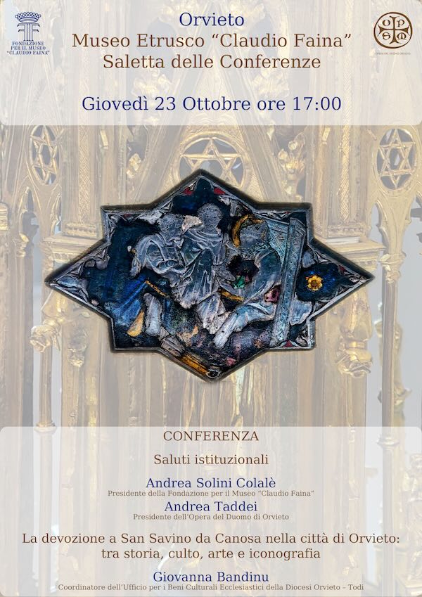 "La devozione a San Savino da Canosa nella città di Orvieto: tra storia, culto, arte e iconografia". È il titolo della conferenza pubblica organizzata dalla Fondazione per il Museo "Claudio Faina" in collaborazione con l’Opera del Duomo di Orvieto in programma per giovedì 23 ottobre alle 17 nella Saletta delle Conferenze del Museo Etrusco "Claudio Faina".